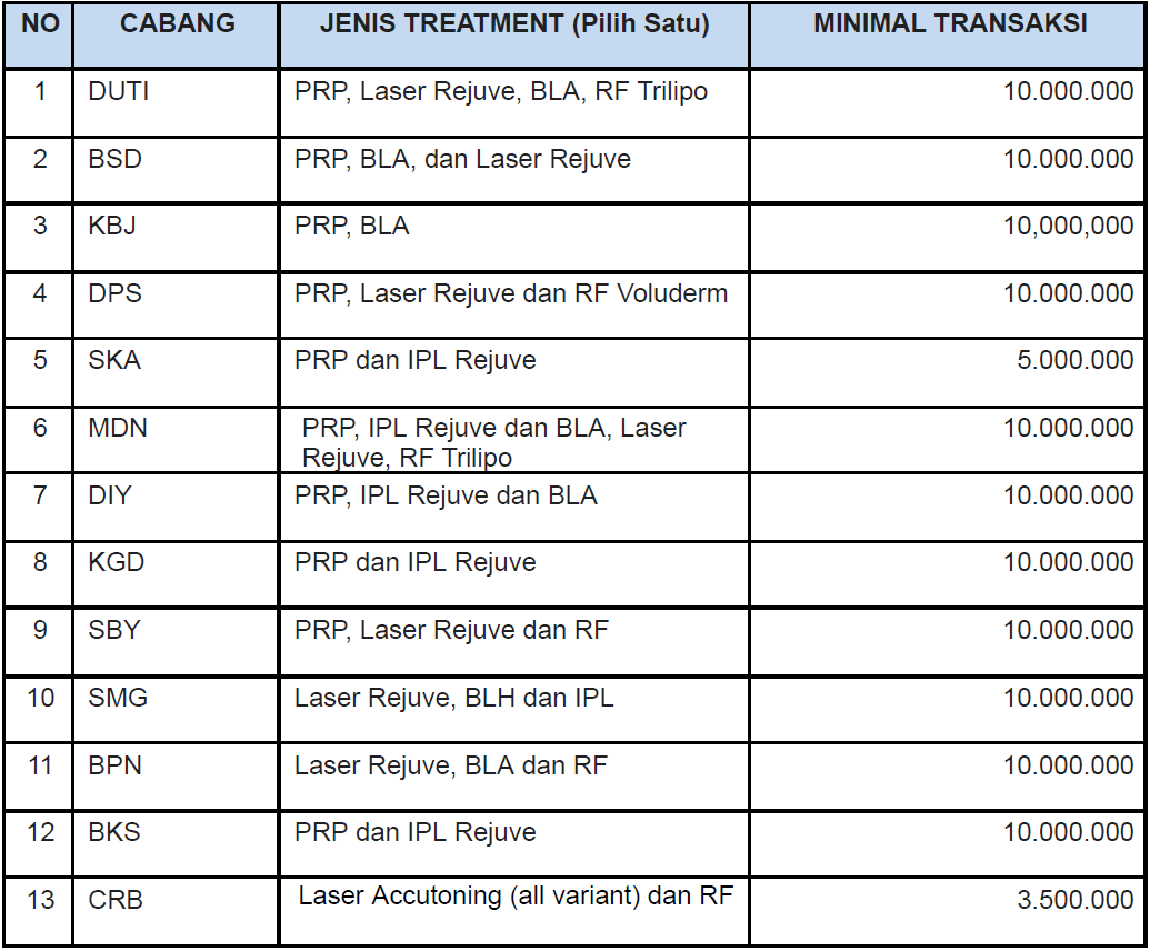 - Pasien baru harus melakukan transaksi minimal Rp 10jt, Rp 5jt, atau Rp 3.5jt (tergantung cabang), dengan ketentuan: